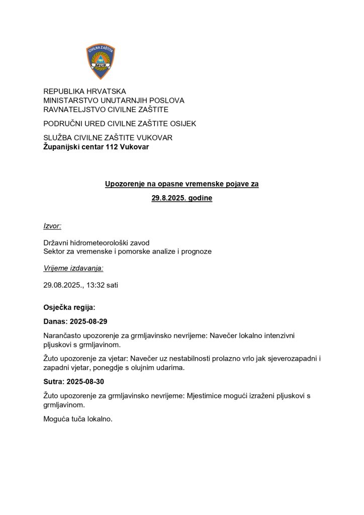 Upozorenje na opasne vremenske pojave za za 29. i 30. kolovoz